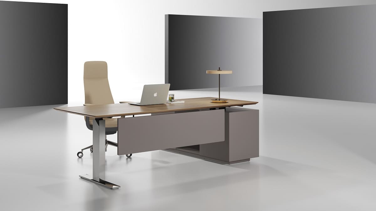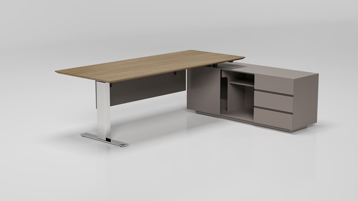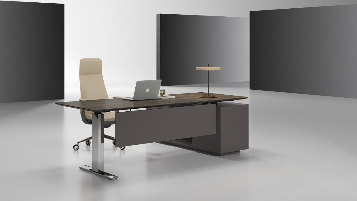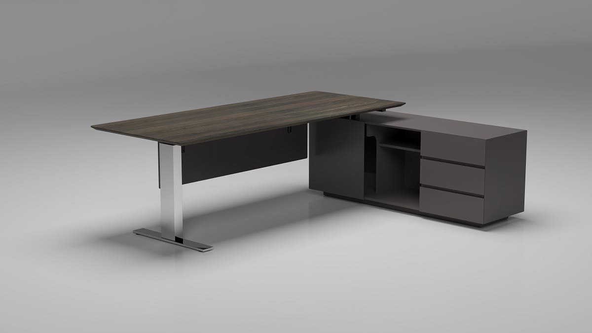 Кабинет руководителя «Ампир» - это воплощение современной деловой эстетики, где строгость форм сочетается с легкостью конструкции и продуманной функциональностью. Минималистичный дизайн, глубокие графитовые оттенки и выразительная древесная текстура создают образ уверенного, технологичного пространства, отражающего характер лидера нового поколения. Лаконичный рабочий стол с визуально «парящей» столешницей и металлическими опорами подчеркивает динамику и актуальность интерьера. Просторная рабочая зона обеспечивает комфорт в течение всего дня, а интегрированная тумба с системой хранения позволяет держать документы и необходимые аксессуары в идеальном порядке. Ничего лишнего - только чистые линии, точные пропорции и функциональность, доведенная до совершенства. «Патриций» - это кабинет для тех, кто ценит эффективность, скорость решений и современный стиль управления.
