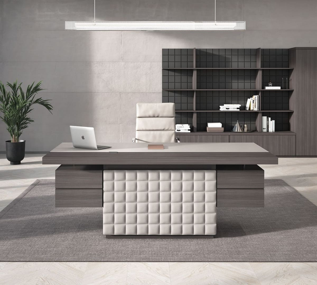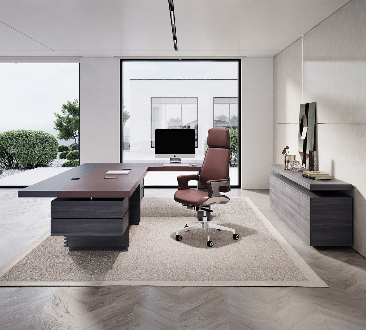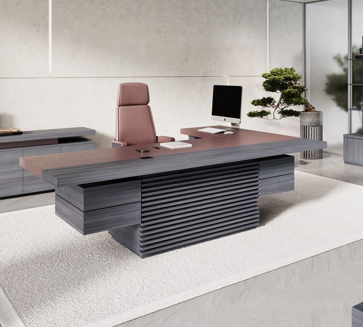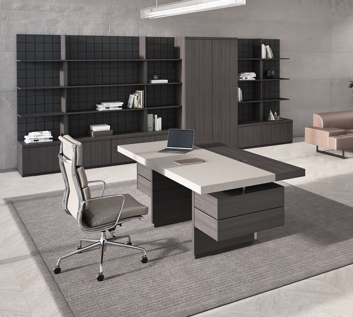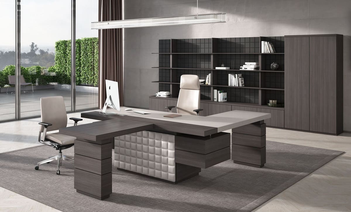 Кабинет руководителя «Интеграл» - это воплощение современной респектабельности и уверенного лидерства. Строгая геометрия форм, благородные древесные оттенки и эффектные фактуры создают атмосферу статуса и продуманной эстетики. Просторный рабочий стол с массивными опорами и выразительной декоративной панелью притягивает внимание и подчеркивает высокий ранг владельца, формируя мощный визуальный акцент в интерьере. Функциональность кабинета продумана до мелочей: удобная система хранения, вместительные шкафы и открытые полки позволяют организовать пространство так, чтобы все необходимое всегда было под рукой, сохраняя безупречный порядок. Широкая столешница обеспечивает комфортную работу и проведение встреч любого уровня, а гармоничное сочетание светлых и темных элементов добавляет интерьеру глубину и характер. «Интеграл» - это не просто мебель, а инструмент имиджа, который подчеркивает стратегическое мышление, уверенность и высокий уровень компании. Идеальное решение для руководителей, которые ценят стиль, комфорт и безупречную деловую атмосферу.