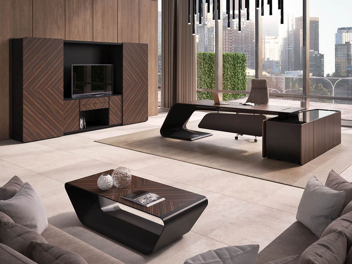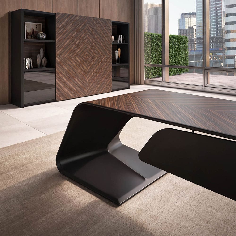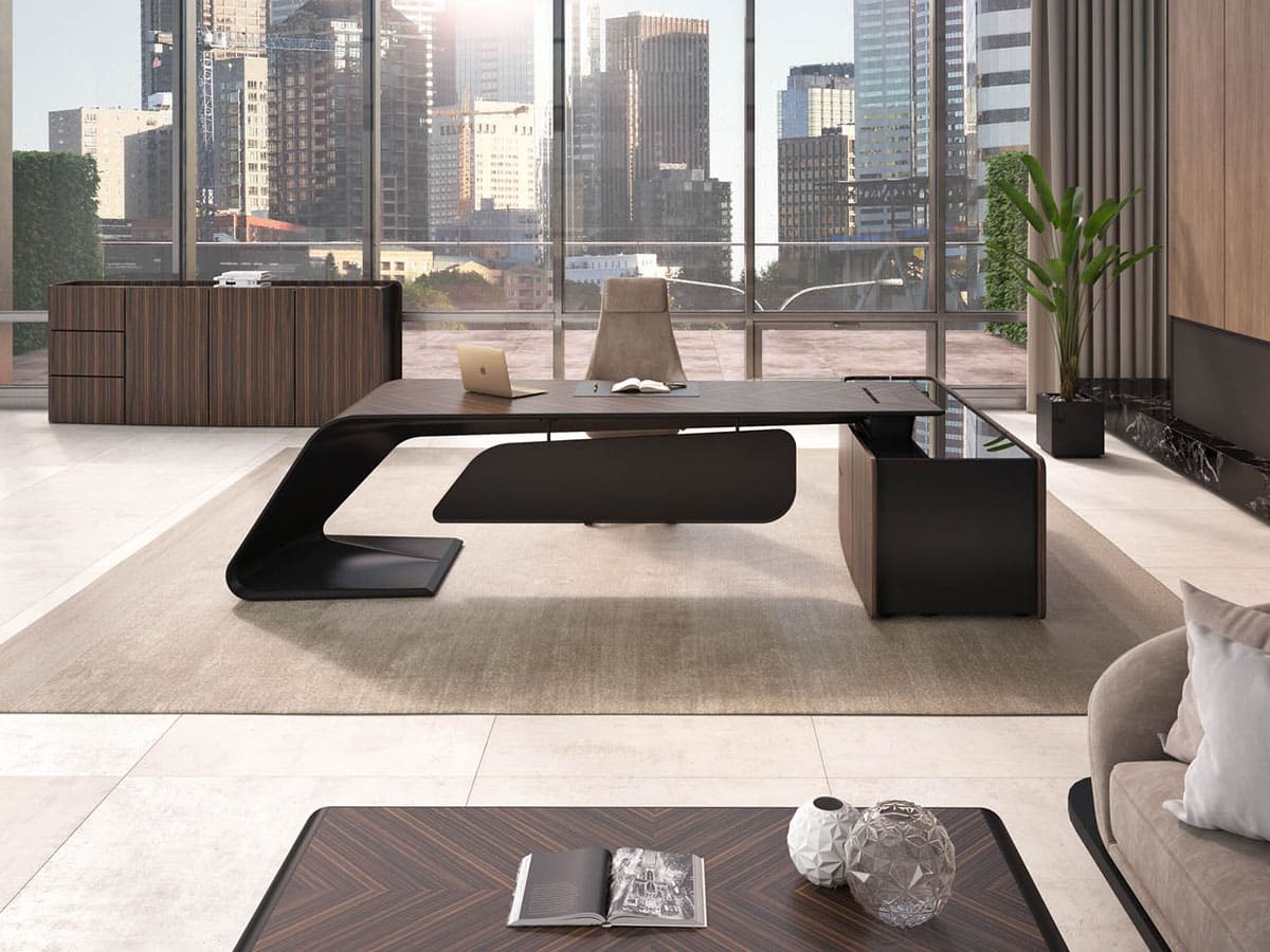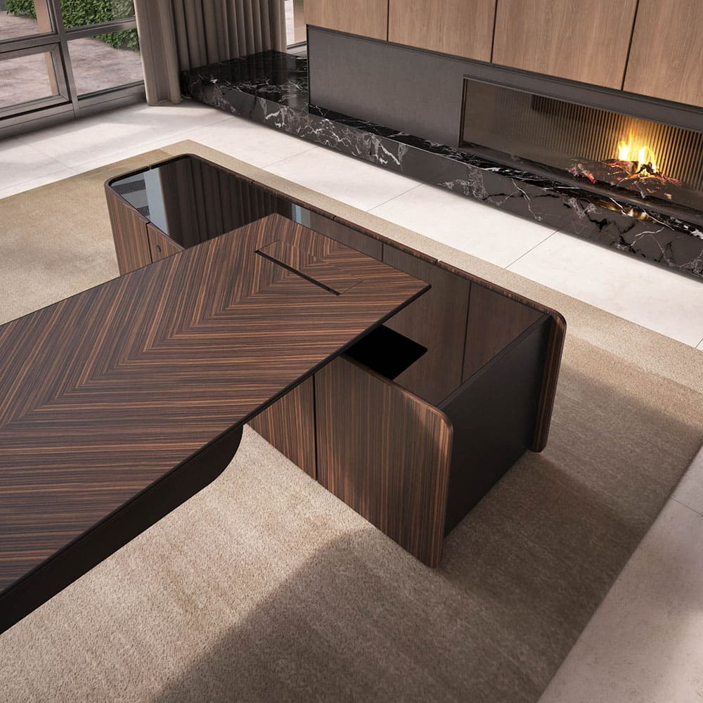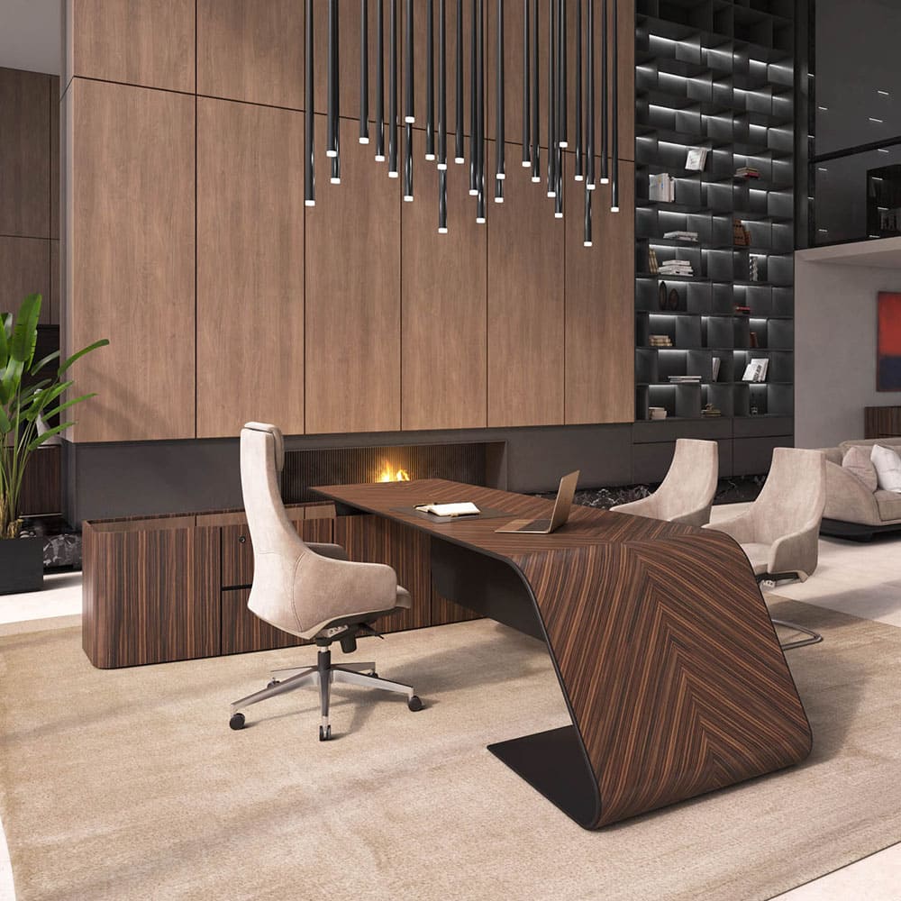 Кабинет руководителя «Люксор» - это смелый дизайн, выразительная пластика форм и безупречная премиальность. Скульптурная конструкция стола с плавными изгибами создает эффект динамики и движения, превращая рабочее место в центральный арт-объект интерьера. Глубокие древесные оттенки и контрастные акценты подчеркивают статус и исключительный вкус владельца. Просторная столешница обеспечивает максимальный комфорт в работе, а продуманная организация пространства позволяет сохранить идеальный порядок и функциональность. «Люксор» формирует атмосферу уверенности, лидерства и амбиций, усиливая имидж компании и производя сильное впечатление с первых минут. Это кабинет для тех, кто привык быть первым и выбирать лучшее.