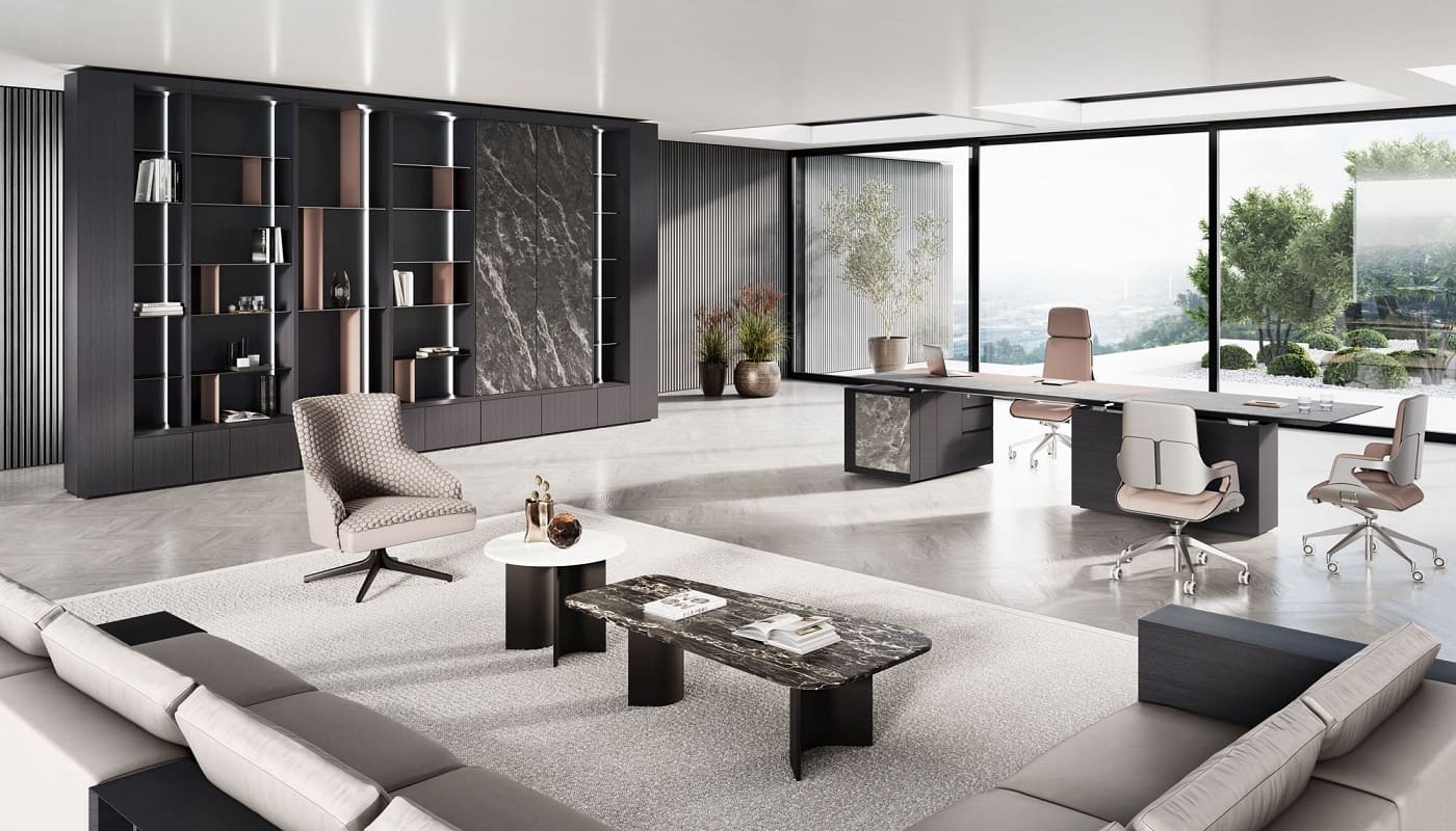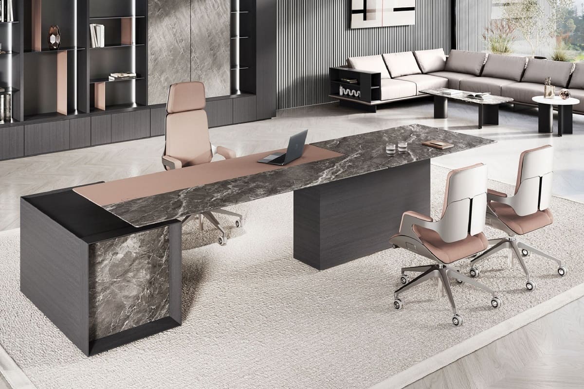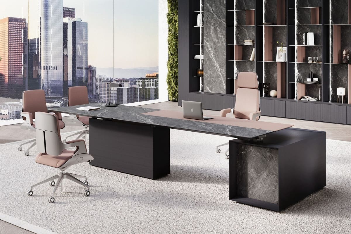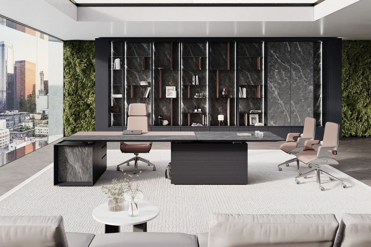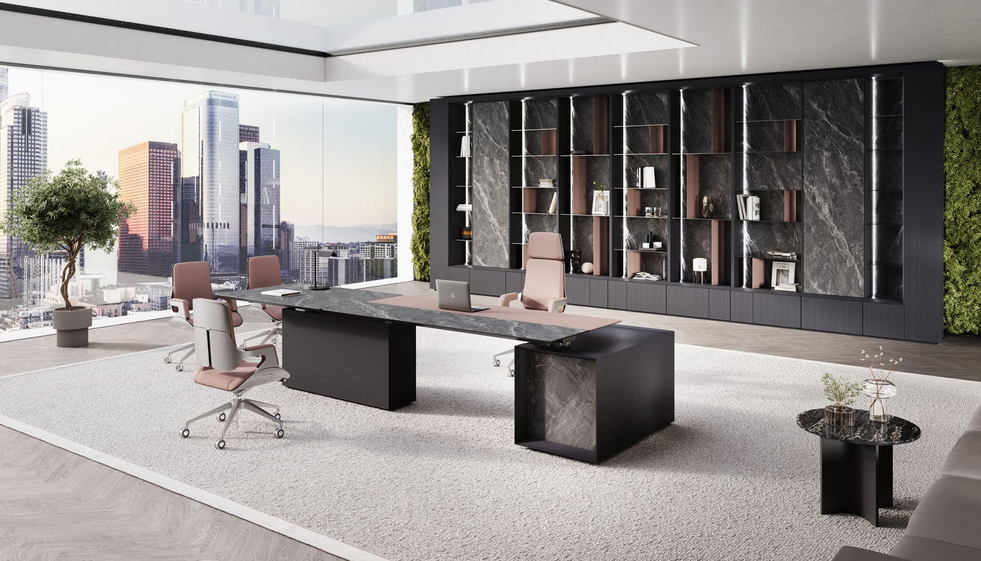 Кабинет руководителя «Модус» - это воплощение силы, статуса и безупречного вкуса в премиальном исполнении. Монументальная эстетика натурального камня, глубокие темные оттенки и выразительные текстуры формируют пространство, которое производит впечатление с первого взгляда. Это интерьер для лидеров, принимающих масштабные решения и задающих направление развития. Массивный рабочий стол с эффектной каменной фактурой становится центральным элементом композиции, подчеркивая основательность и уверенность владельца. Широкая столешница обеспечивает максимальный комфорт для работы и переговоров, а продуманная система хранения и открытые стеллажи создают презентабельный фон, усиливающий статус кабинета. Каждая деталь продумана до мелочей - от пропорций до сочетания материалов, чтобы пространство выглядело целостным и безупречным. «Модус» — это больше, чем мебель. Это символ стабильности, престижа и власти.