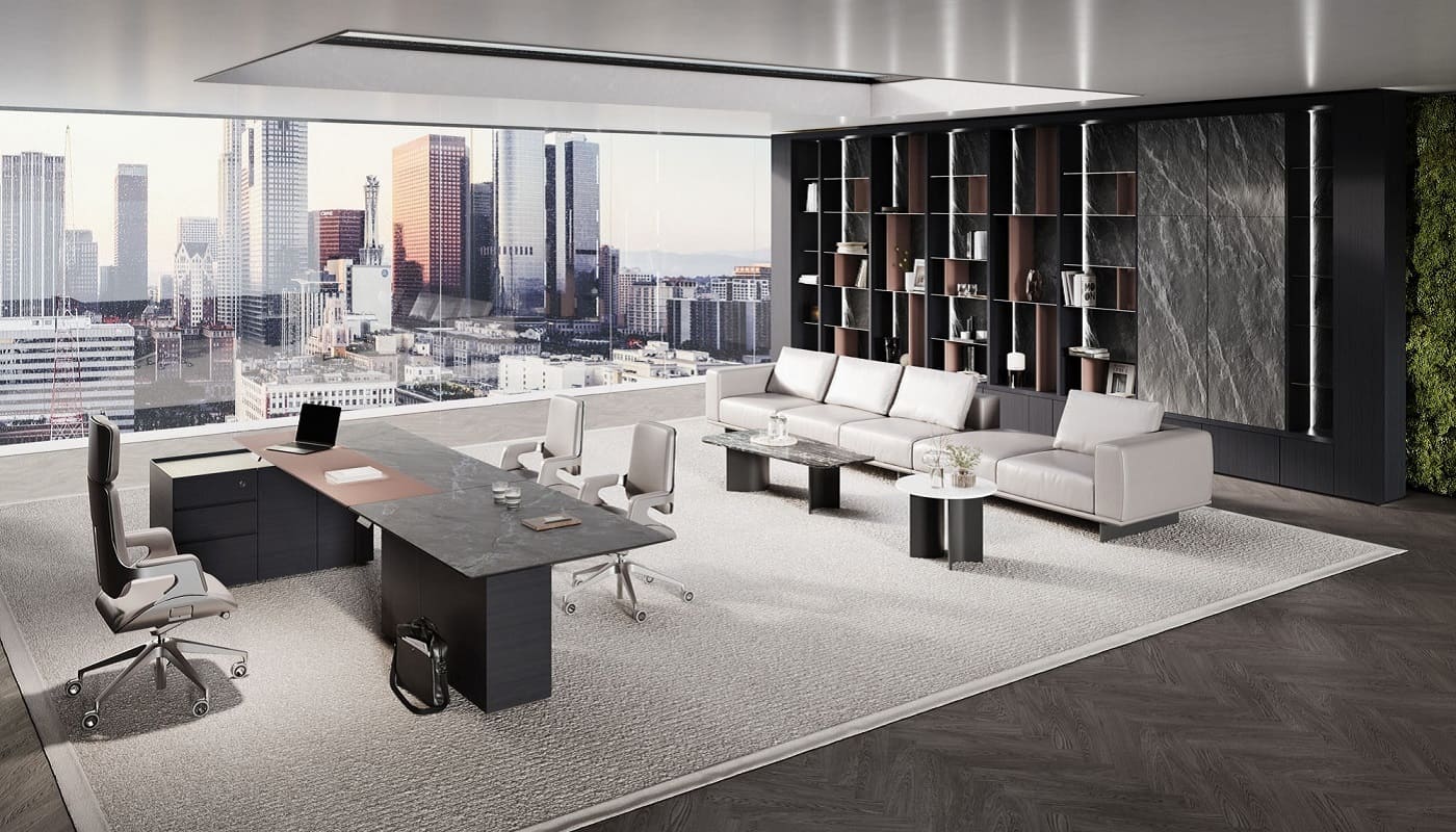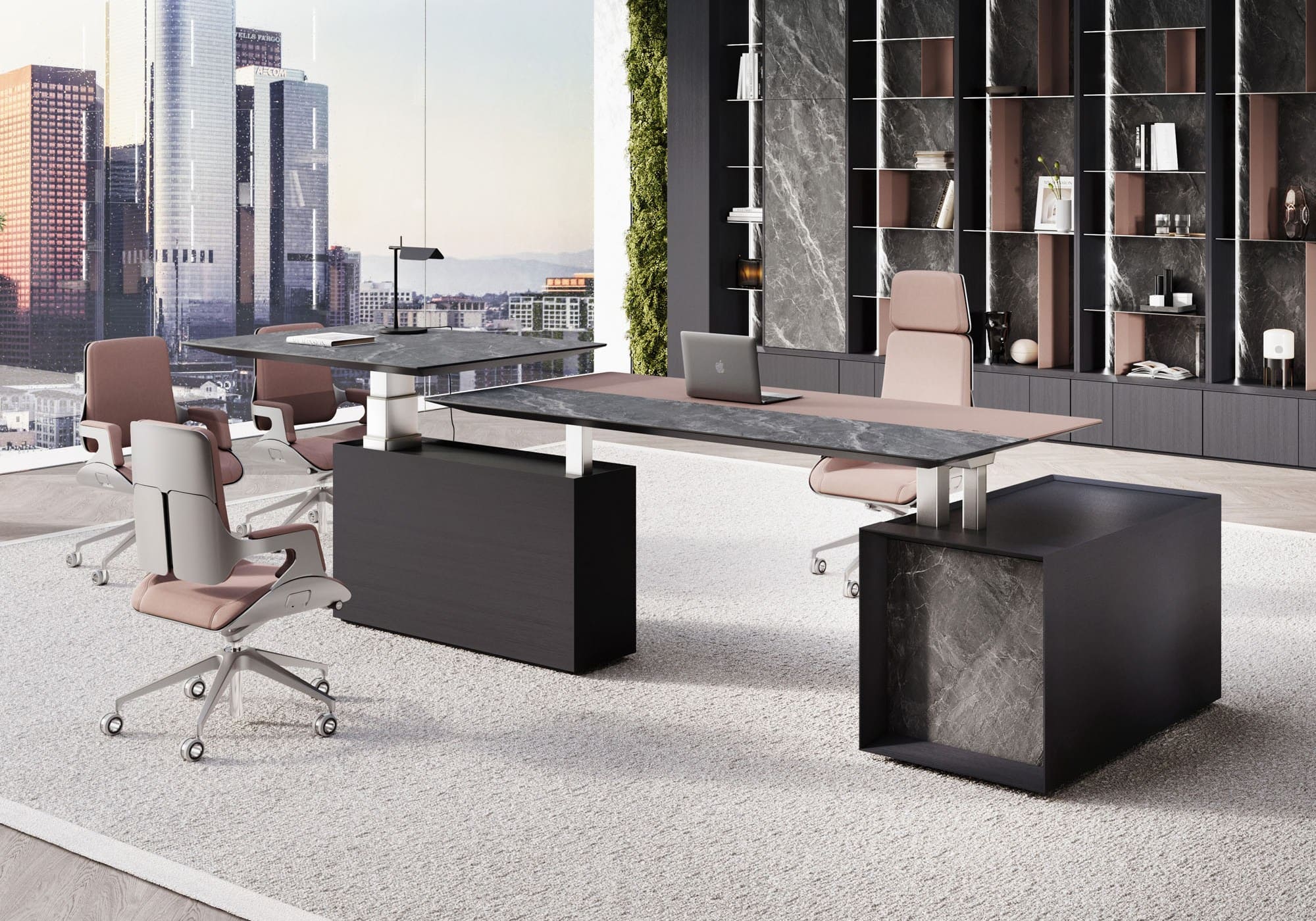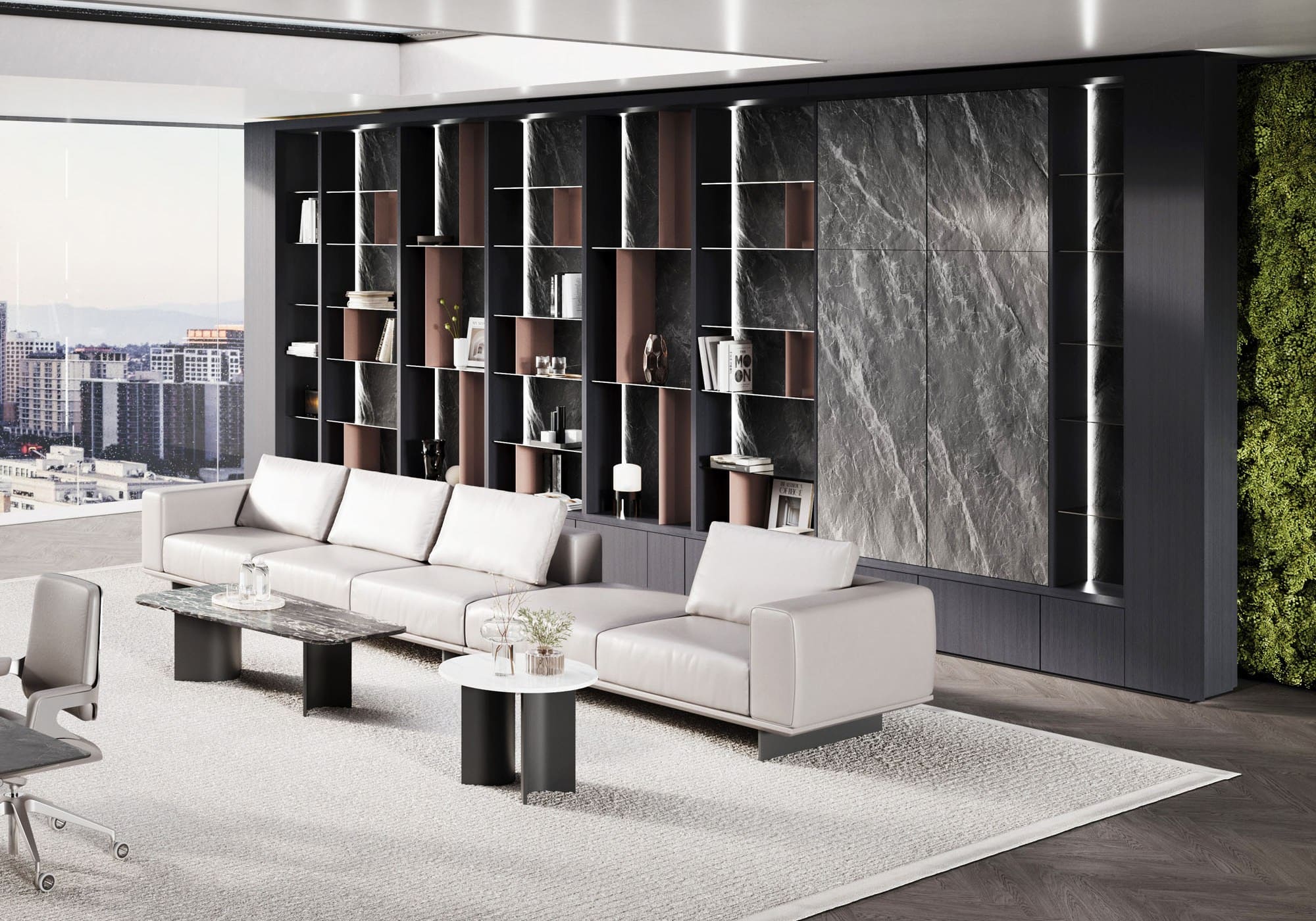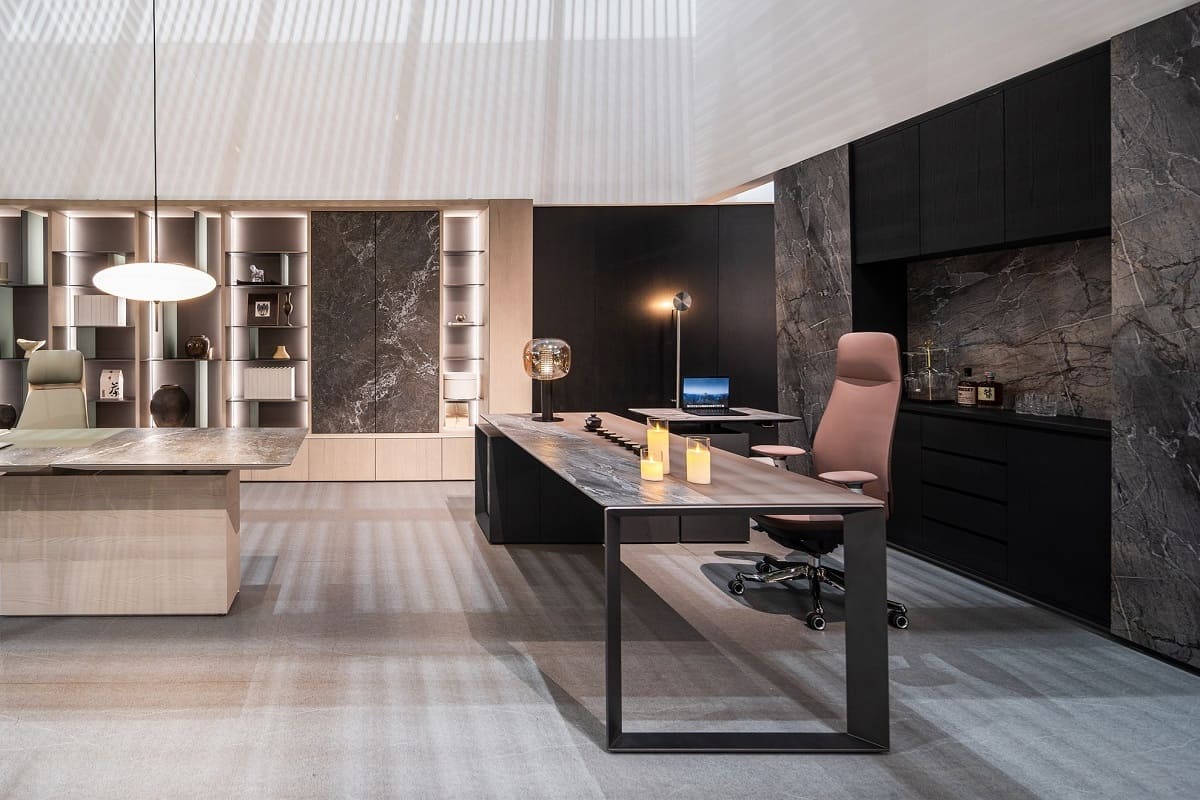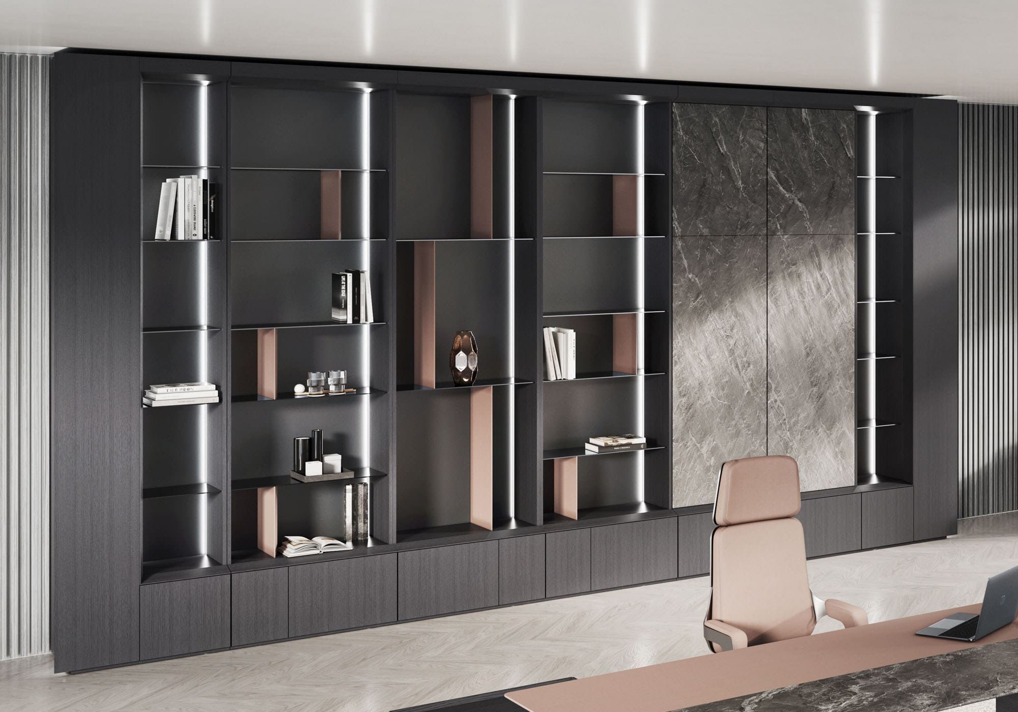 Кабинет руководителя «Модус» - это воплощение силы, статуса и безупречного вкуса в премиальном исполнении. Монументальная эстетика натурального камня, глубокие темные оттенки и выразительные текстуры формируют пространство, которое производит впечатление с первого взгляда. Это интерьер для лидеров, принимающих масштабные решения и задающих направление развития. Массивный рабочий стол с эффектной каменной фактурой становится центральным элементом композиции, подчеркивая основательность и уверенность владельца. Широкая столешница обеспечивает максимальный комфорт для работы и переговоров, а продуманная система хранения и открытые стеллажи создают презентабельный фон, усиливающий статус кабинета. Каждая деталь продумана до мелочей - от пропорций до сочетания материалов, чтобы пространство выглядело целостным и безупречным. «Модус» — это больше, чем мебель. Это символ стабильности, престижа и власти.