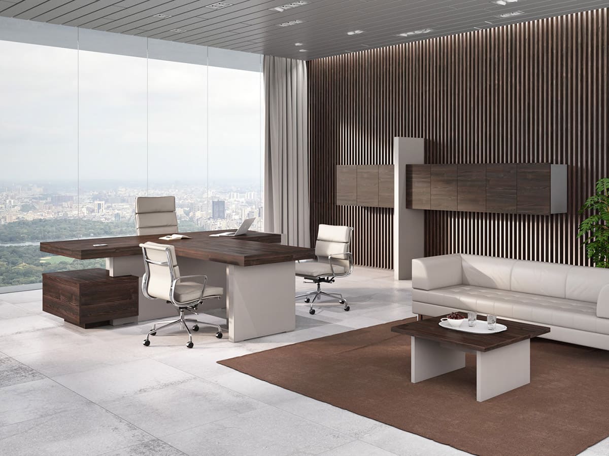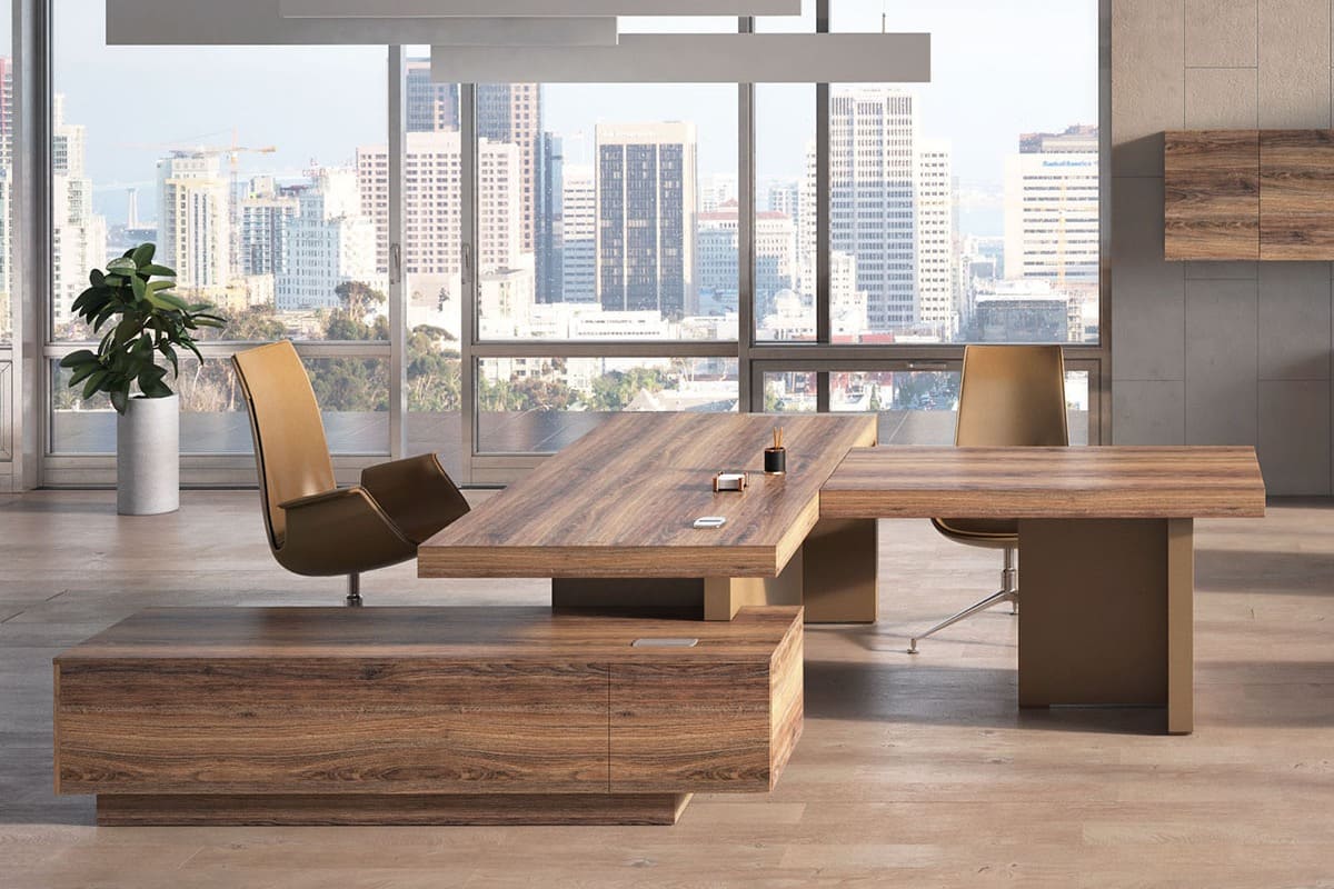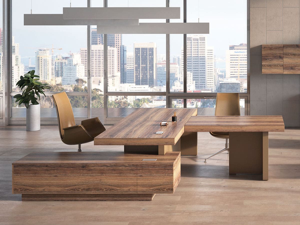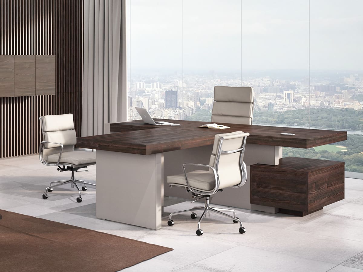 Кабинет руководителя «Патриций» - это современная интерпретация статуса и уверенности, воплощенная в выразительной архитектуре форм и благородной древесной текстуре. Натуральные оттенки, массивные объемы и продуманная геометрия создают атмосферу устойчивости и спокойной силы, подчеркивая масштаб личности владельца и высокий уровень компании. Широкая столешница с эффектной толщиной и четкими линиями формирует внушительный центр композиции, обеспечивая простор для продуктивной работы и комфортных переговоров. Дополнительные модули и системы хранения гармонично дополняют рабочую зону, позволяя организовать пространство без лишних деталей и визуального шума. «Патриций» — это не просто кабинет, а продуманная деловая среда, где каждая деталь работает на имидж.