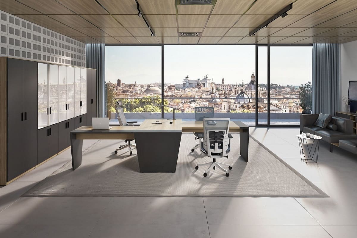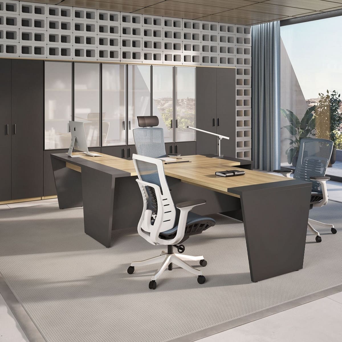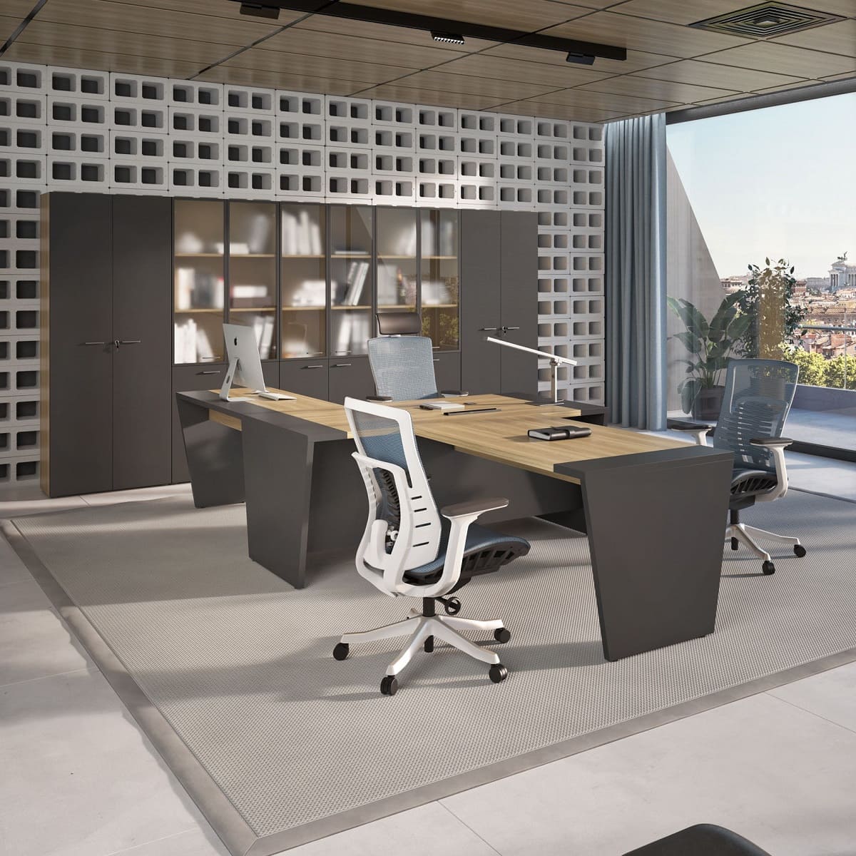 Кабинет руководителя «Вектор» - это пространство, в котором статус чувствуется с первого взгляда. Современная геометрия форм, благородное сочетание натурального дерева и глубоких графитовых оттенков создают атмосферу уверенности, силы и стратегического мышления. Широкая столешница обеспечивает максимальный комфорт для работы, переговоров и принятия важных решений, а продуманная система хранения с вместительными шкафами поддерживает идеальный порядок без визуального шума. Панорамные окна наполняют кабинет естественным светом и открывают вдохновляющий вид на город, усиливая ощущение масштаба и перспективы. Эргономичная организация пространства подчеркивает заботу о деталях: каждая линия, каждая фактура работает на имидж владельца. «Вектор» - это не просто кабинет, а инструмент влияния, который формирует правильное впечатление у партнеров и подчеркивает высокий уровень компании.