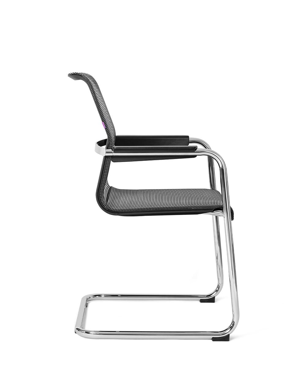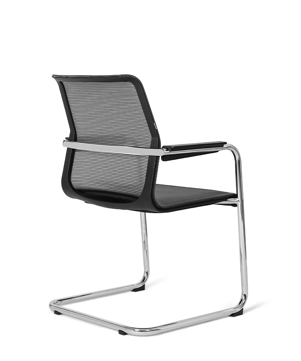 Кресло «Маяк» - это современное и функциональное решение для переговорных комнат и конференц-залов, где важны комфорт, презентабельность и надежность. Строгий черный цвет и лаконичный дизайн легко вписываются в интерьер любого уровня - от классического офиса до стильного бизнес-пространства. Дышащая 3D-сетка на спинке и сиденье обеспечивает оптимальную вентиляцию и комфорт даже при длительных встречах, а анатомическая форма спинки поддерживает правильное положение тела. Хромированное основание придает модели солидность и устойчивость, алюминиевая опорная планка усиливает конструкцию и подчеркивает современный характер дизайна. Продуманная форма переднего края сиденья снижает нагрузку на ноги, а пластиковые накладки на полозьях защищают напольное покрытие и повышают устойчивость.