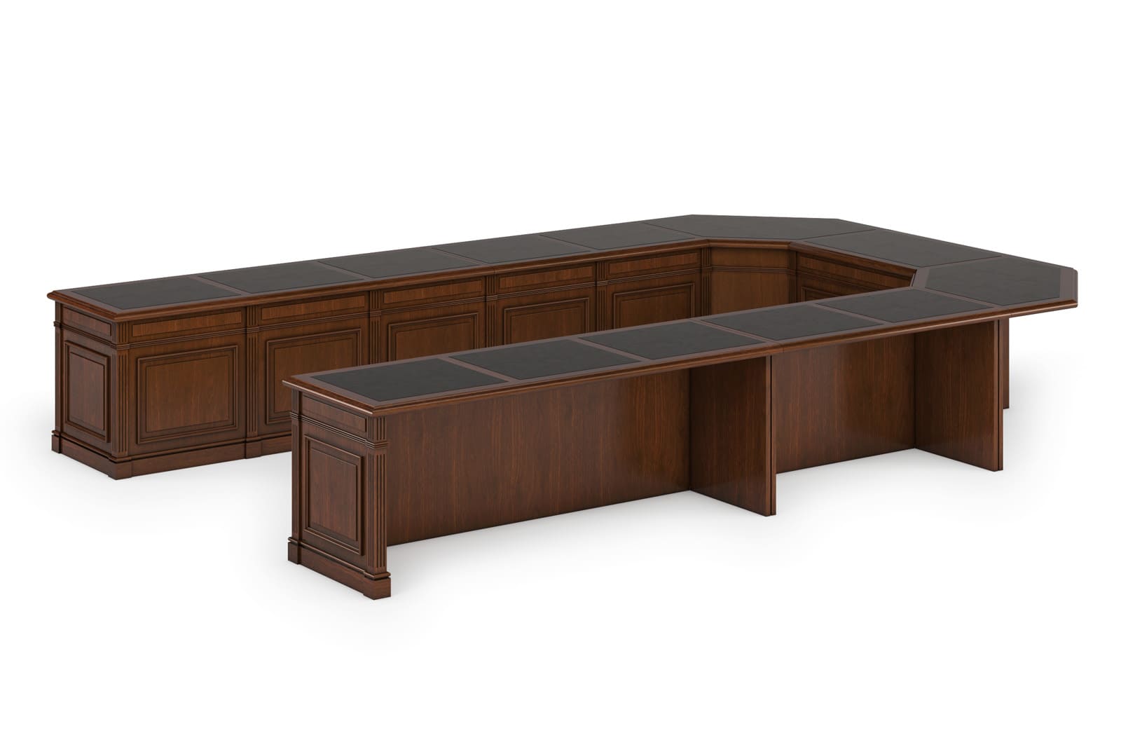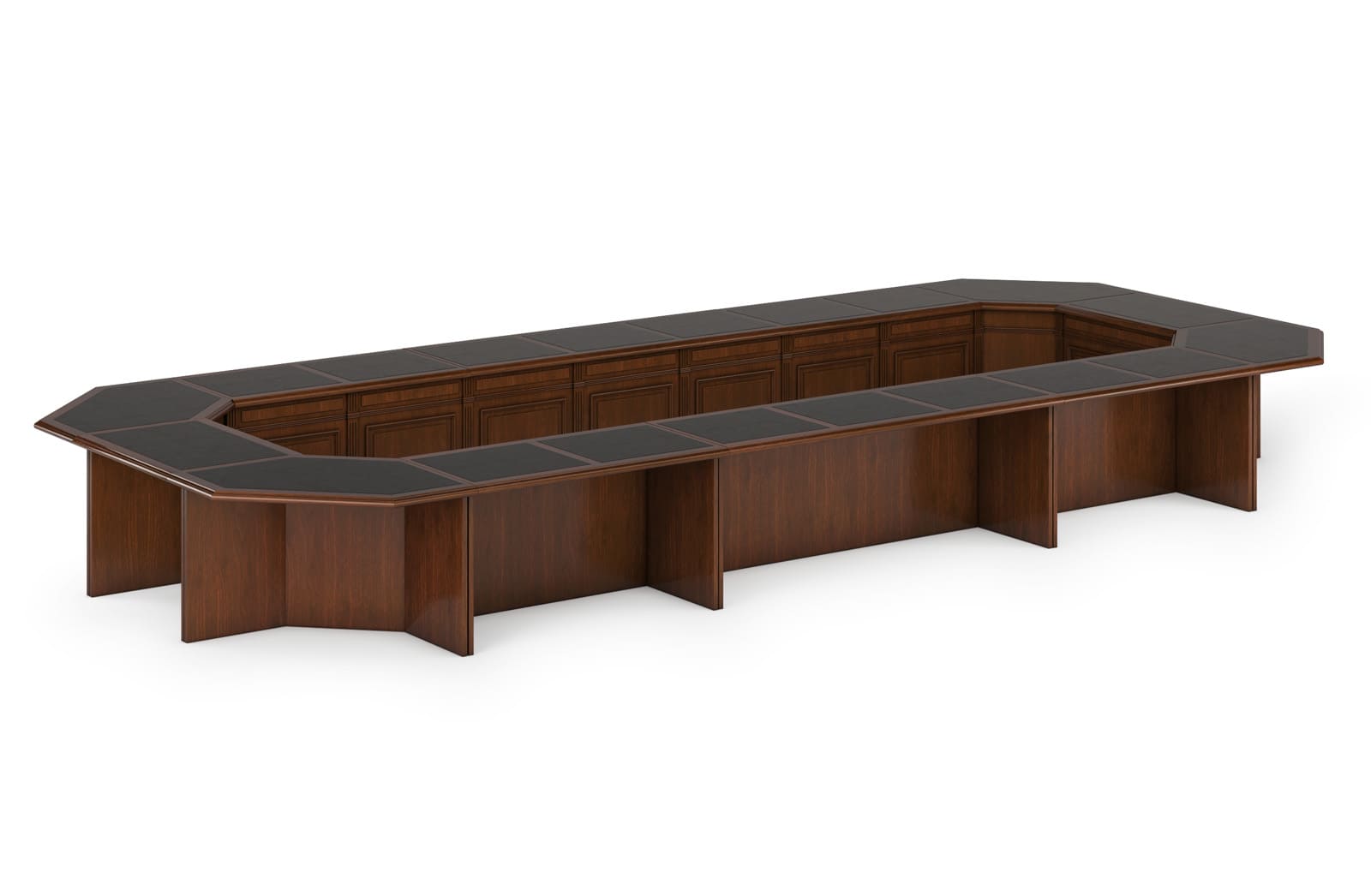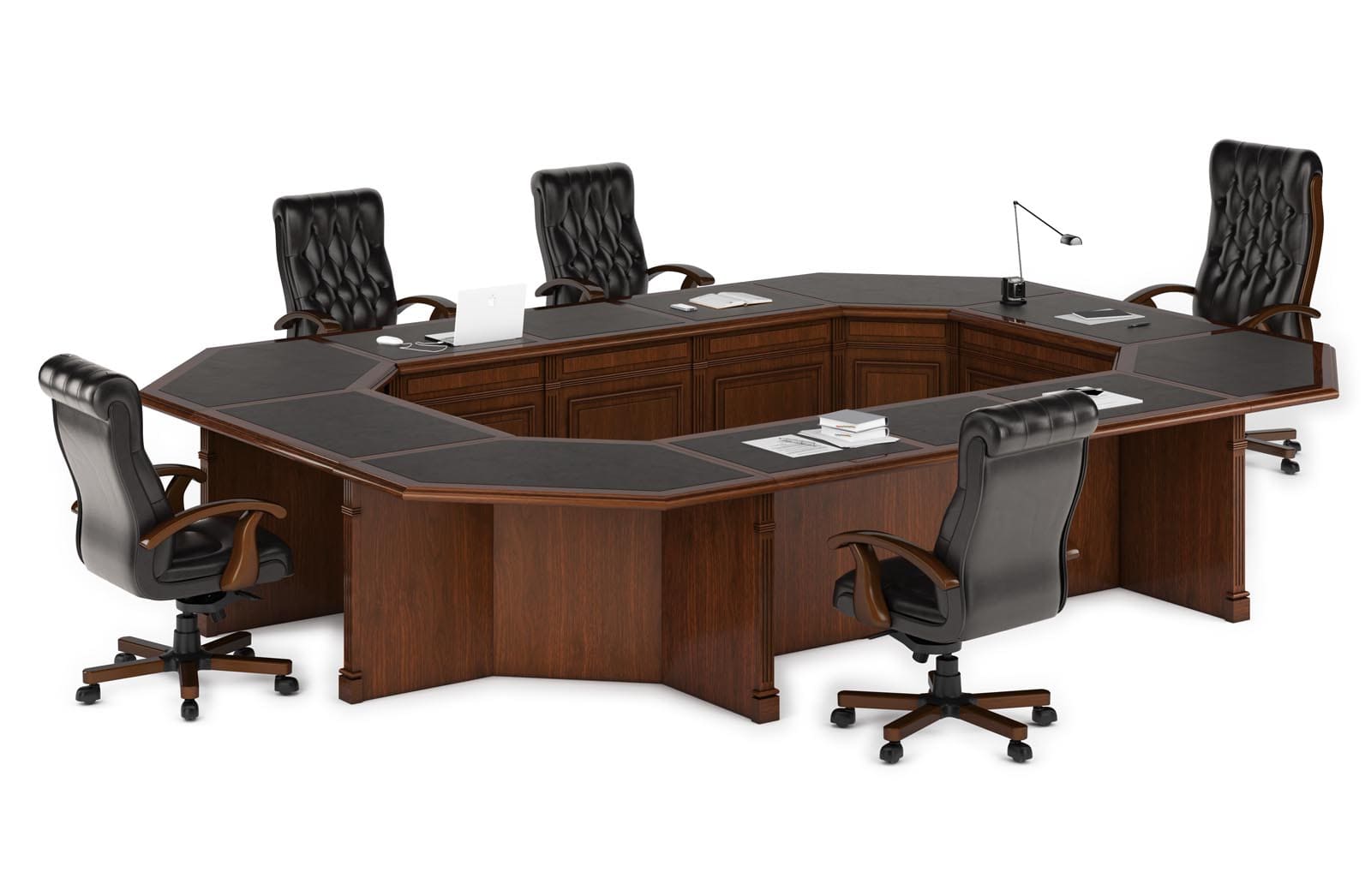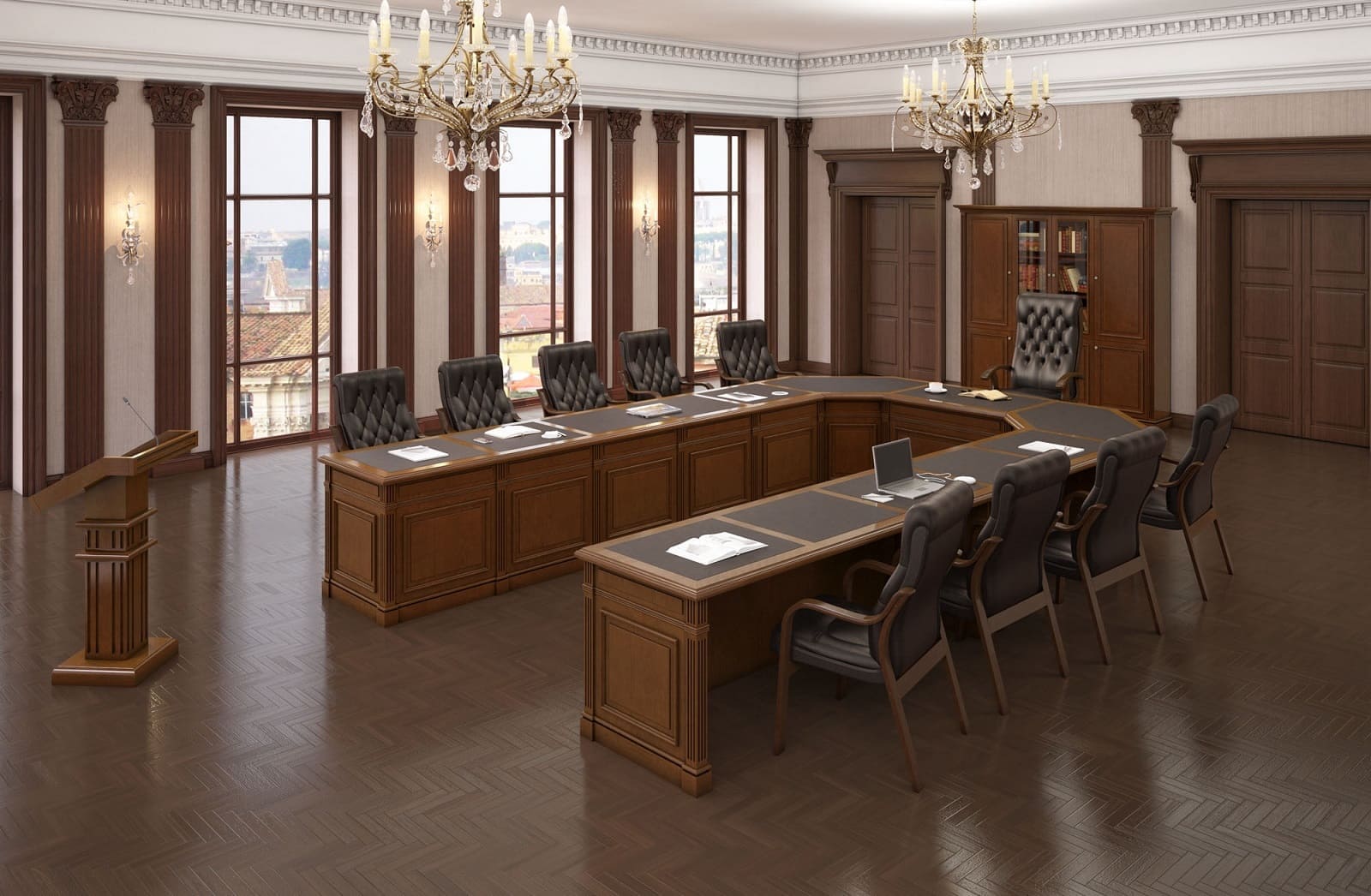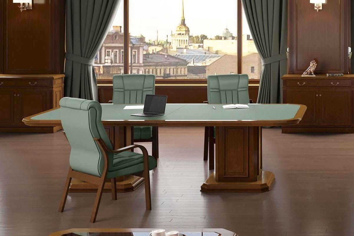 Столы переговоров «Премьер» создают в переговорной комнате атмосферу респектабельности и деловой сосредоточенности. Массивное основание, выразительная геометрия и благородная отделка формируют солидный интерьер, подчеркивающий статус компании и важность проводимых встреч. Просторная столешница обеспечивает комфортную работу участников совещаний, позволяя удобно размещать документы, ноутбуки и презентационные материалы. Гармоничное сочетание классических форм и современных решений делает мебель этой серии подходящей для представительских кабинетов, залов совещаний и переговорных пространств высокого уровня.