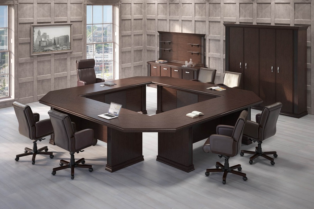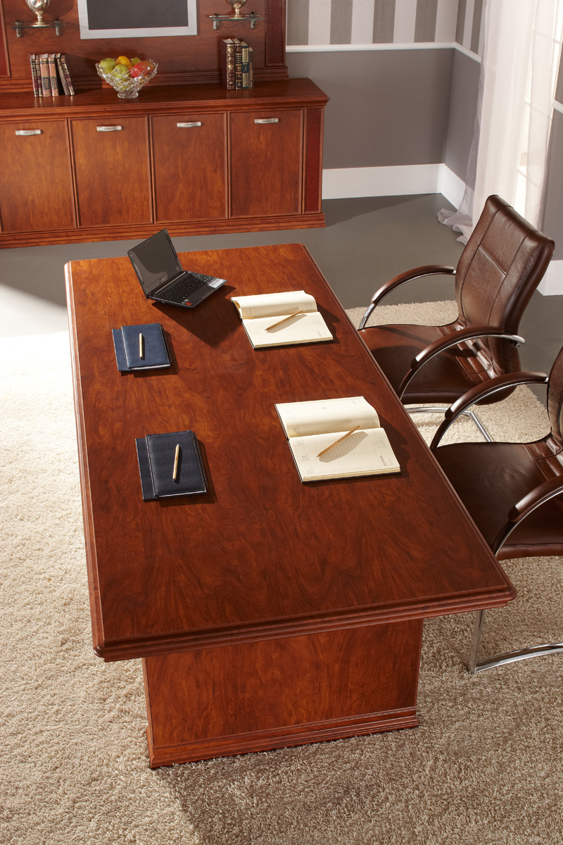 Столы переговоров «Синтез» - это классическое решение для оформления солидных переговорных комнат и кабинетов руководителей. Благородные древесные оттенки, массивные формы и строгая геометрия создают атмосферу респектабельности и делового статуса. Конструкция стола позволяет удобно разместить участников встречи, обеспечивая комфортное пространство для обсуждения важных вопросов, работы с документами и проведения деловых переговоров. Продуманная композиция и классический стиль делают «Синтез» гармоничным элементом интерьера, подчеркивая престиж компании и формируя атмосферу уверенности, стабильности и продуктивного делового общения.
